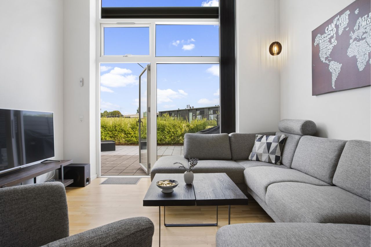 dejligt lysindfald og en fantastisk rumfølelse og en god planløsning.