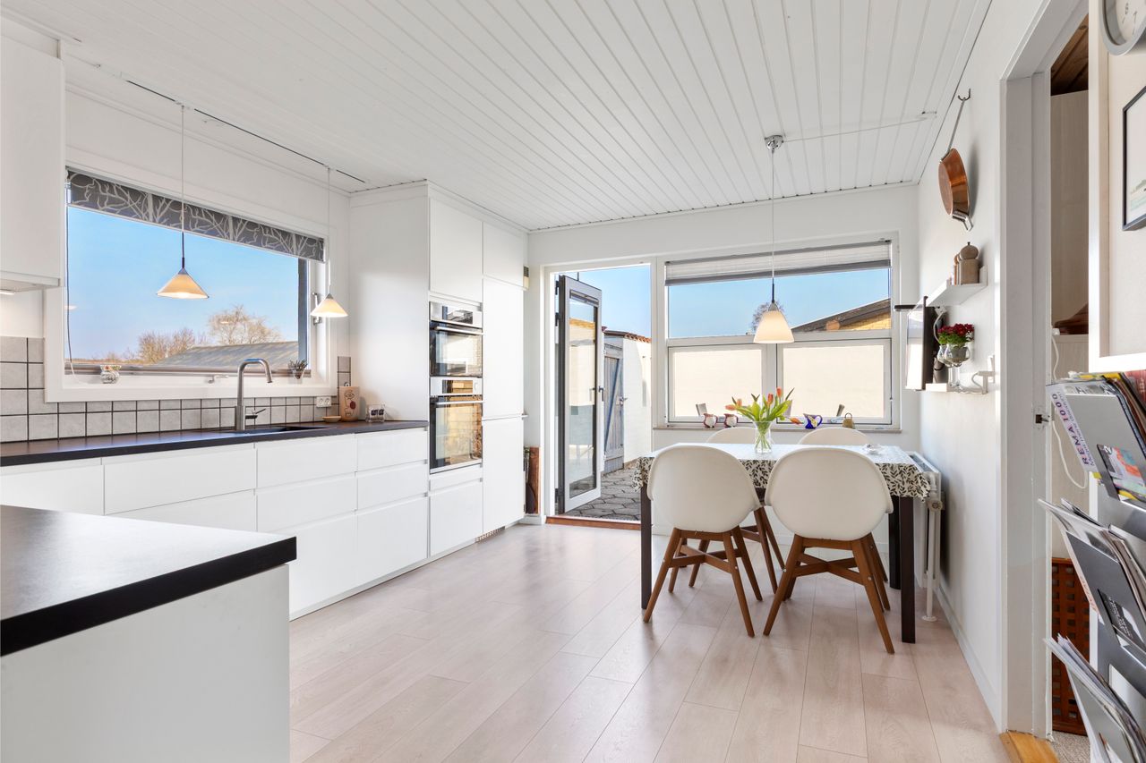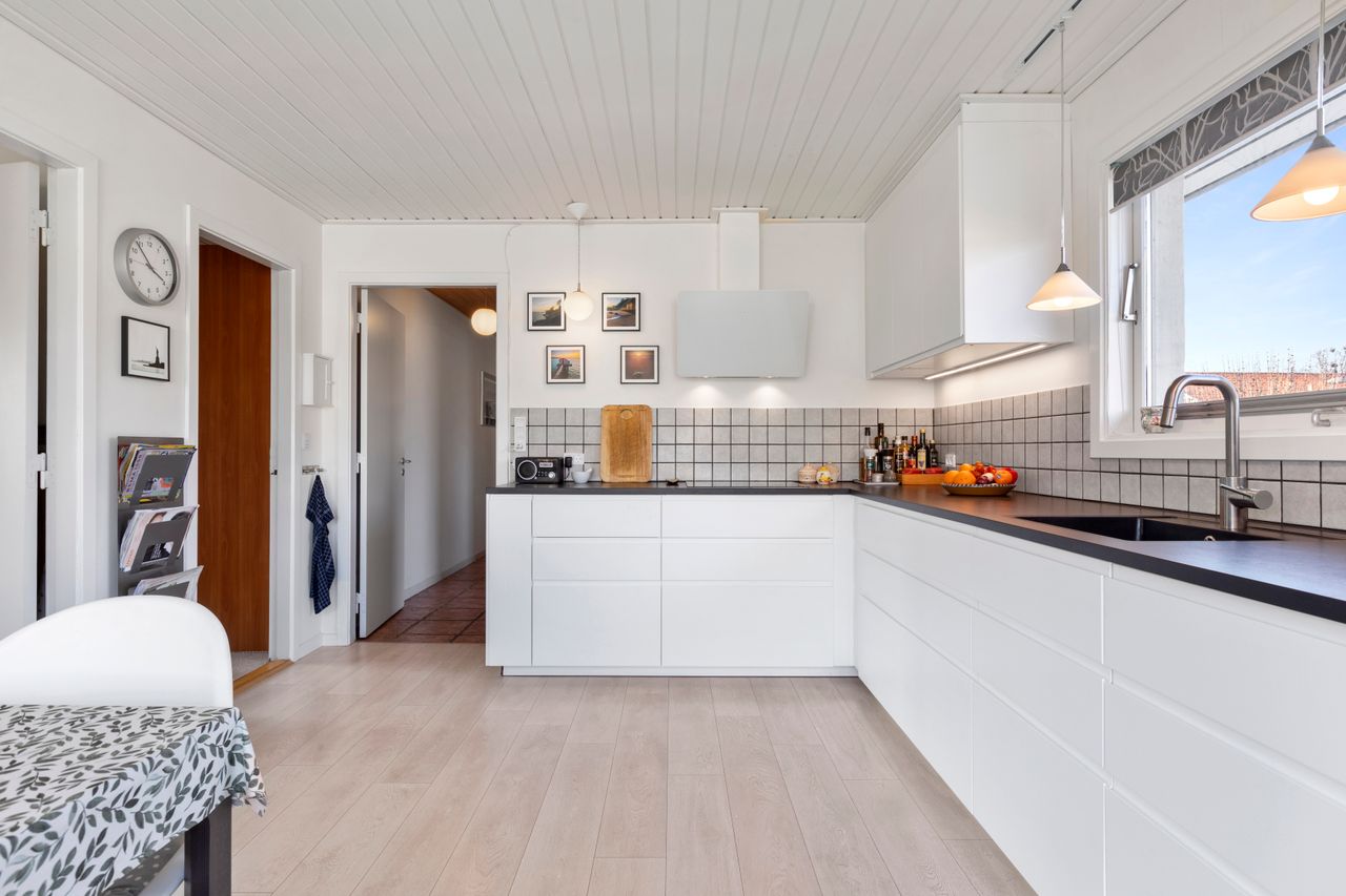 Stor entré. Her er plads til hvis man evt. vil etablere et gæstetoilet. Fra entréen er der adgang til et godt værelse med indbyggede skabe. Flot badeværelse fra 2015, og et stort lyst køkken med dejligt stort vinduesparti, som giver et godt lys og hvor der er direkte adgang til en af huset terrasser. Det er også i denne ende af huset de resterende to værelser er. De to store stuer i forlængelse af hinanden har et dejligt lys b.la. pga. ovenlysvinduet. I den bagerste del af stuen er der en hyggelig brændeovn og udgang til den store overdækkede terrasse.