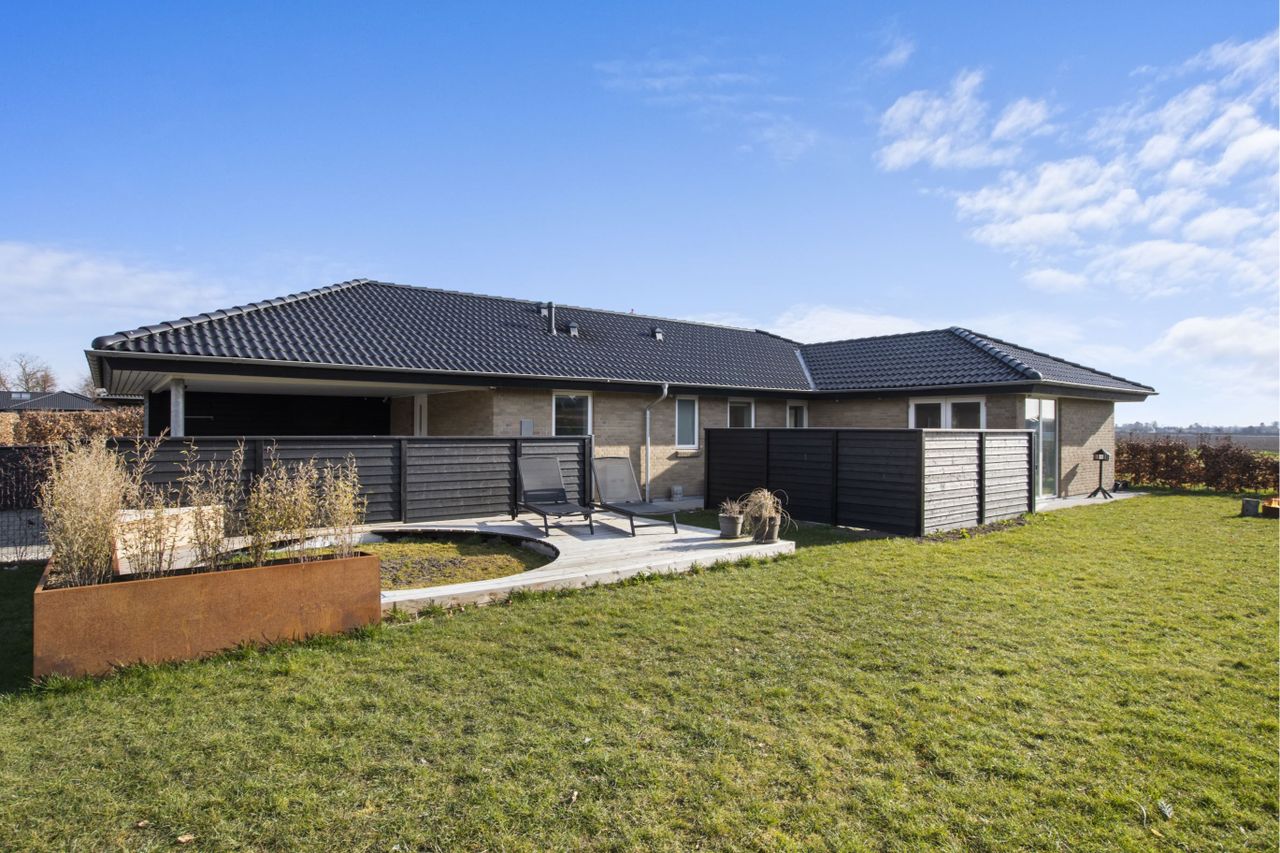 Flot Eurodanhus fra 2016 med 39 kvm. integreret carport og skøn have med flere terrasser