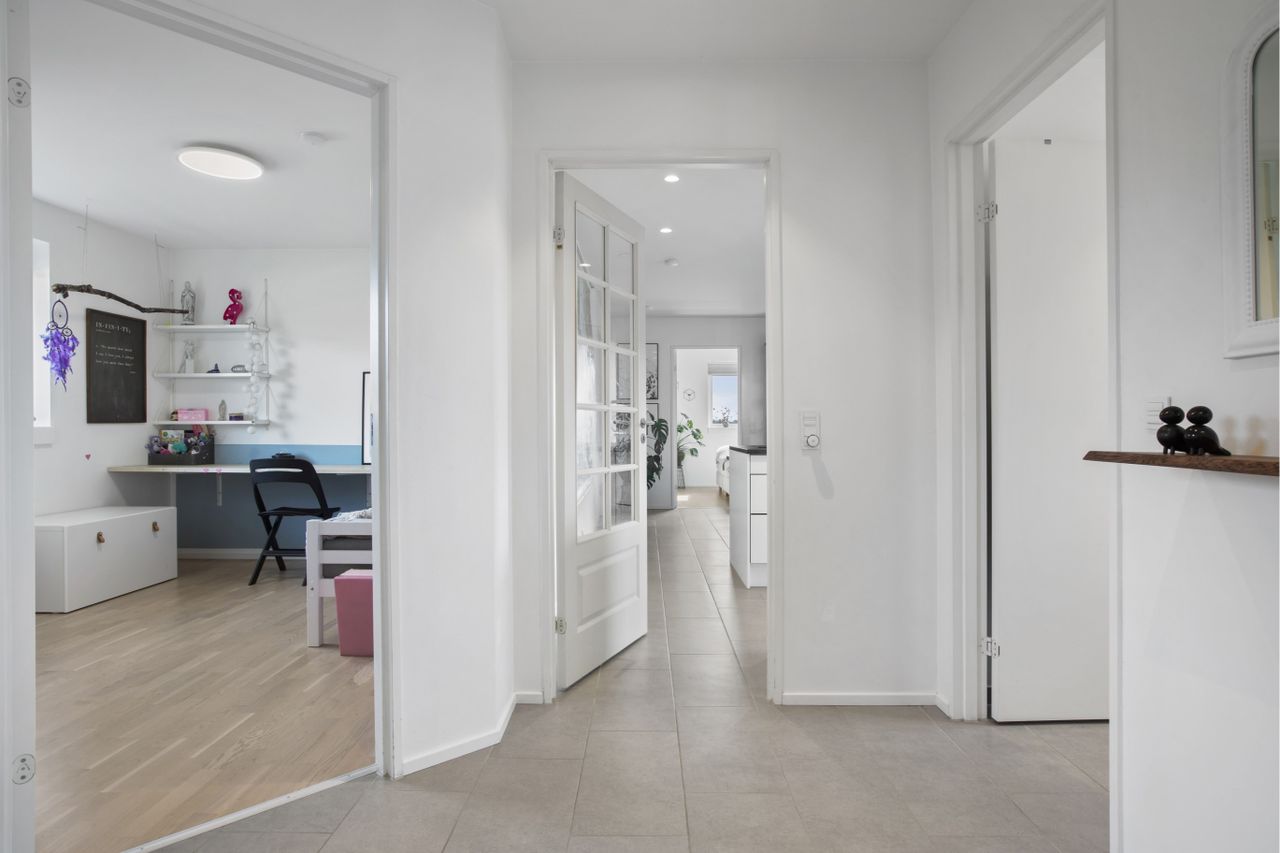 med stuen hvor der også er mulighed for at komme ud på den store fliseterrasse. I alt fire gode værelser