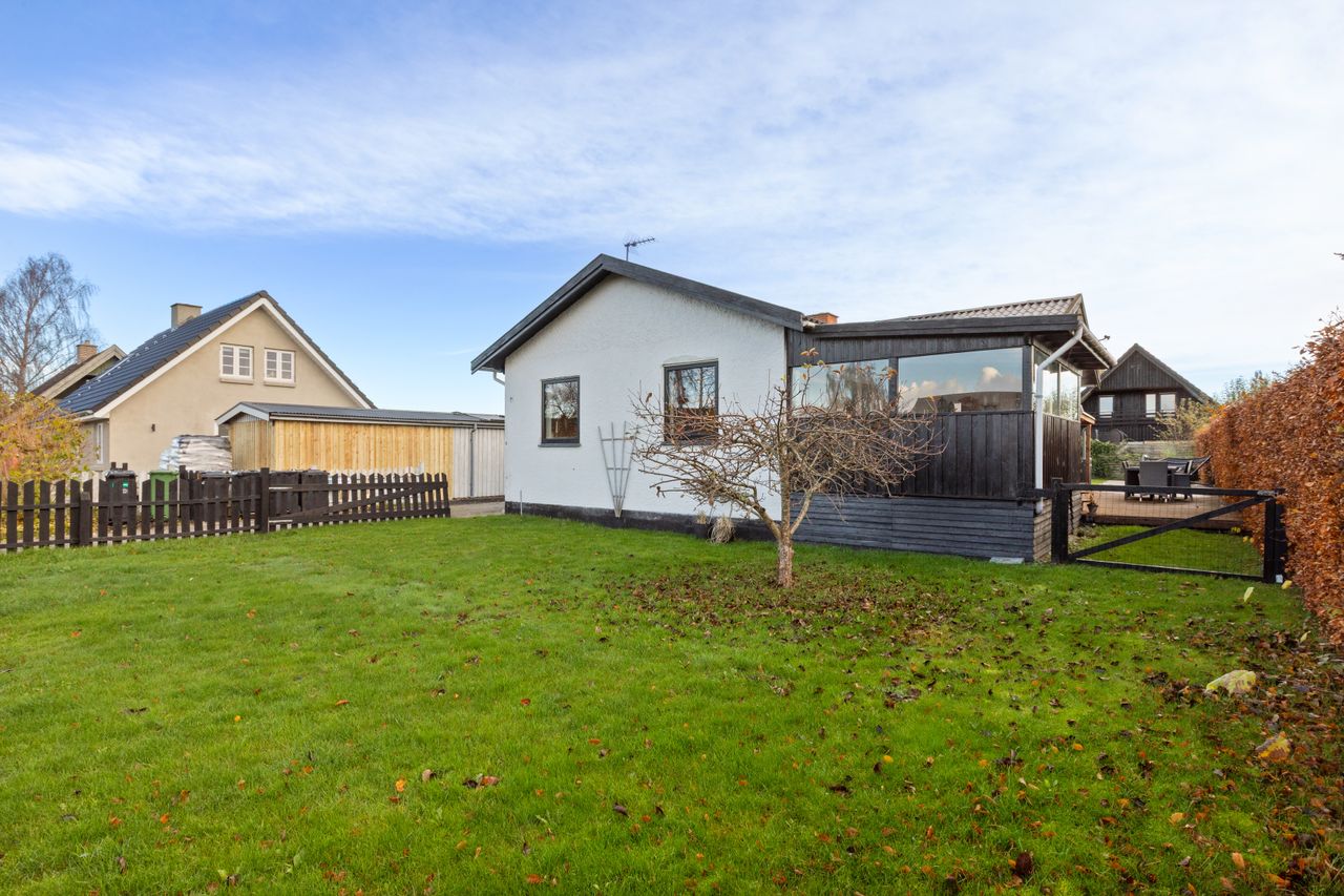 Udendørsarealerne byder på en nem og overskuelig have med god plads til fodboldmål og trampolin. Haven er med frugttræer og skøn overdækket træterrasse.